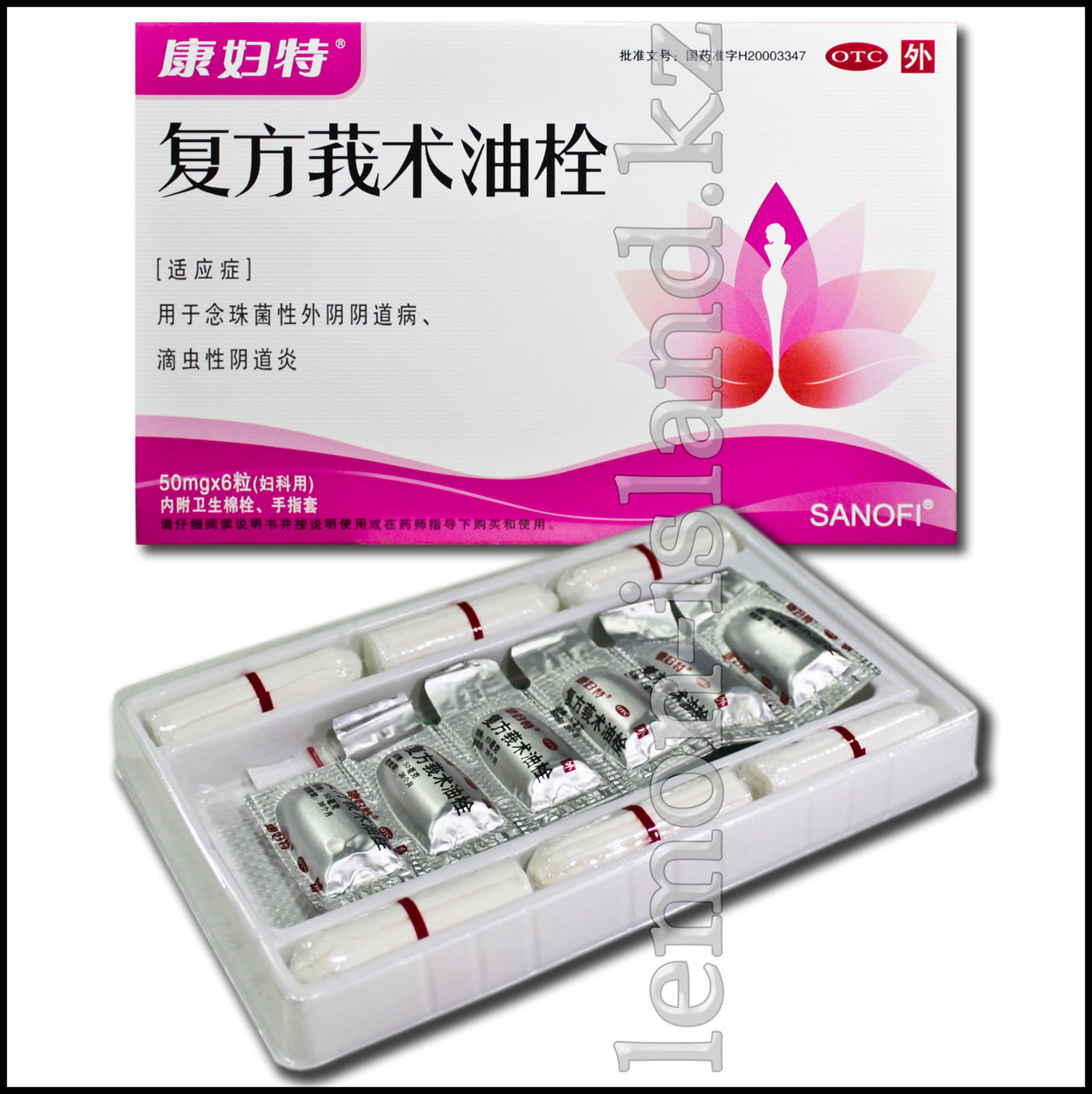 1 қаптама - 6 суппозиторий және 6 тампон - бір емдеу курсы. Қажет болса, курсты 10 күннен кейін қайталаңыз. Профилактикалық курс - 3 шам.